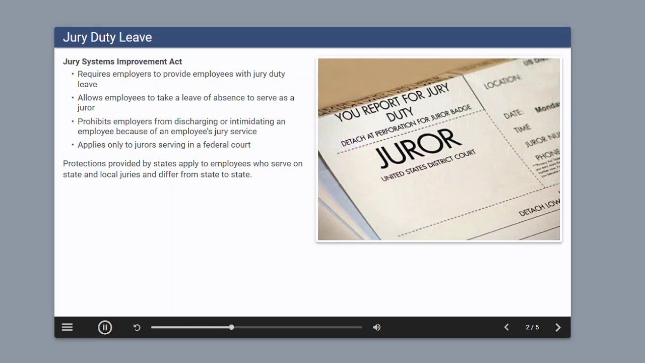 The goal of this lesson is to introduce employees to the federal laws that cover absences from the workplace for jury duty leave, military leave, and family and medical leave.