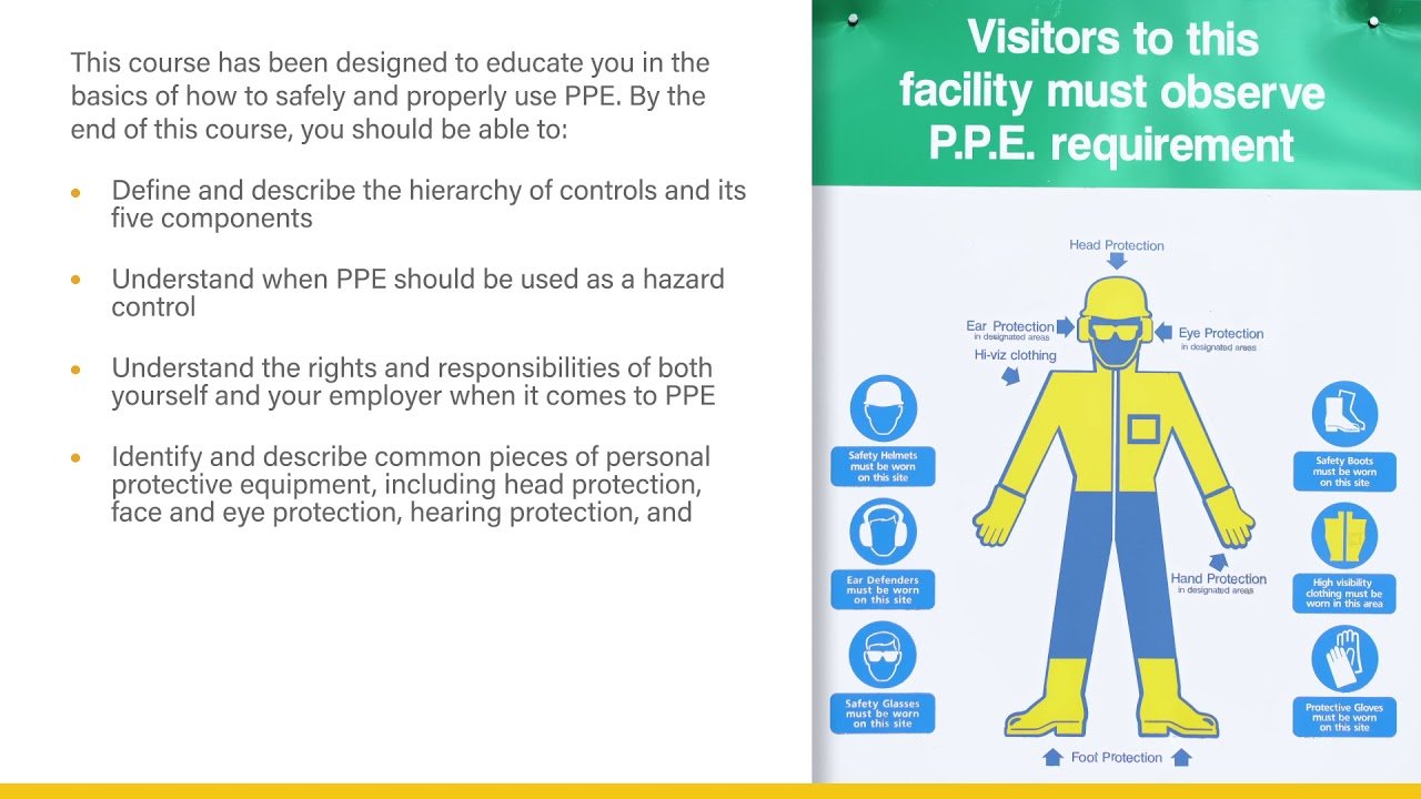 Personal protective equipment (PPE) is a worker’s last line of defense against worksite hazards. As such, it is vital that all employees know how to properly select, use, and maintain all pieces of PPE required on their jobsite. This course teaches learners the basics of various forms of PPE, including hardhats, eye and face protection, hearing protection, and hand and foot protection. This course also covers the “hierarchy of hazard controls” as well as the rights and responsibilities of workers and employers when it comes to PPE. The course also gives a brief overview of some other common, but more specialized, forms of PPE, such as fall protection, body and limb protection, and high-visibility safety apparel. Please note that respiratory protection is NOT covered in this course; rather, respiratory protection is covered in much more depth in it’s own, dedicated course.