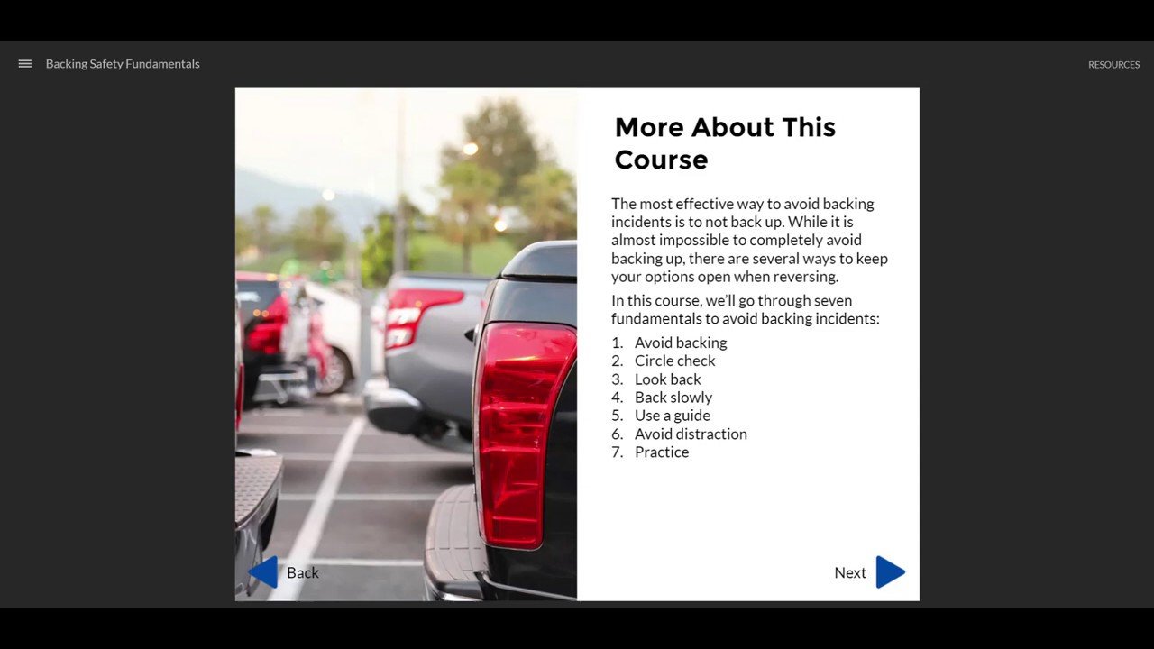Looking where you are going is a concept taught to us since childhood but often employees back up without looking back either through the rear window or using mirrors. Many drivers do not use mirrors to their optimal effectiveness due to misunderstandings on how to properly adjust them. Correct mirror adjustment is a key component taught in this section of the course.