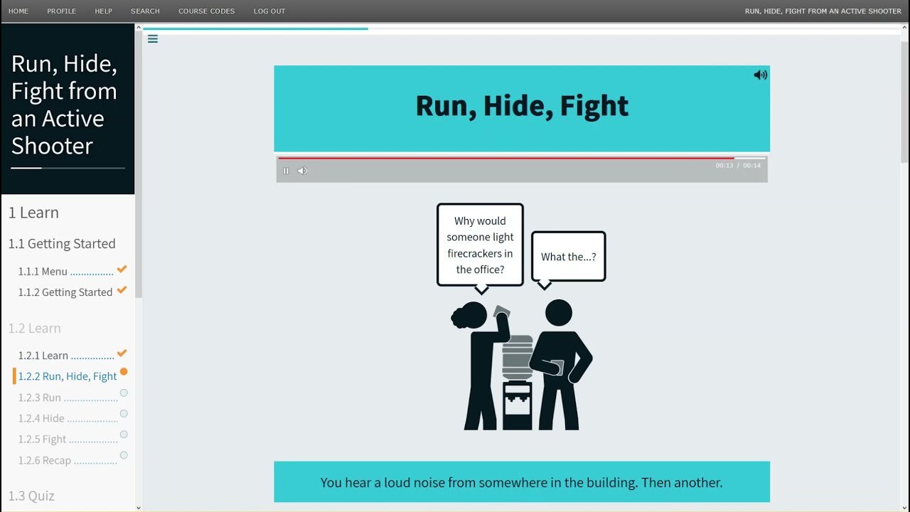 This curriculum blends in learnings from the latest FBI research to enhance the Run-Hide-Fight strategy promoted by US Homeland Security. Easily customize the learning for your specific work conditions, policies, and Emergency Action Plan.