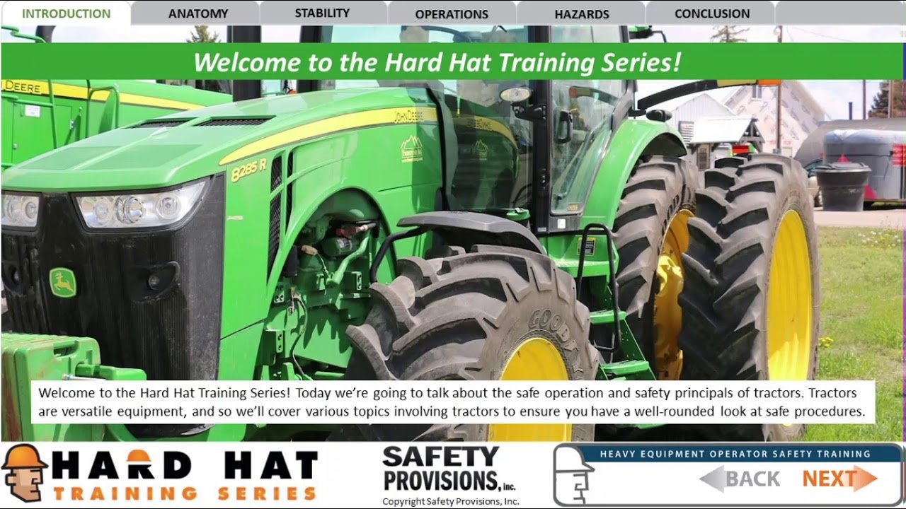 This course is an online, Canada-Compliant and I-CAB Recognized Training Class for Tractors. This course satisfies Canada’s requirements for the classroom portion of operator safety training. Quiz questions along the way prepare you for the final written exam. Upon completion, gain access to and print off your test, certificate, and a checklist which can be used by your employer to administer the required practical observation.